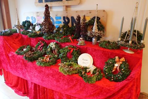 En masser julekranser står flot på et bord som er dækket med en rød dug